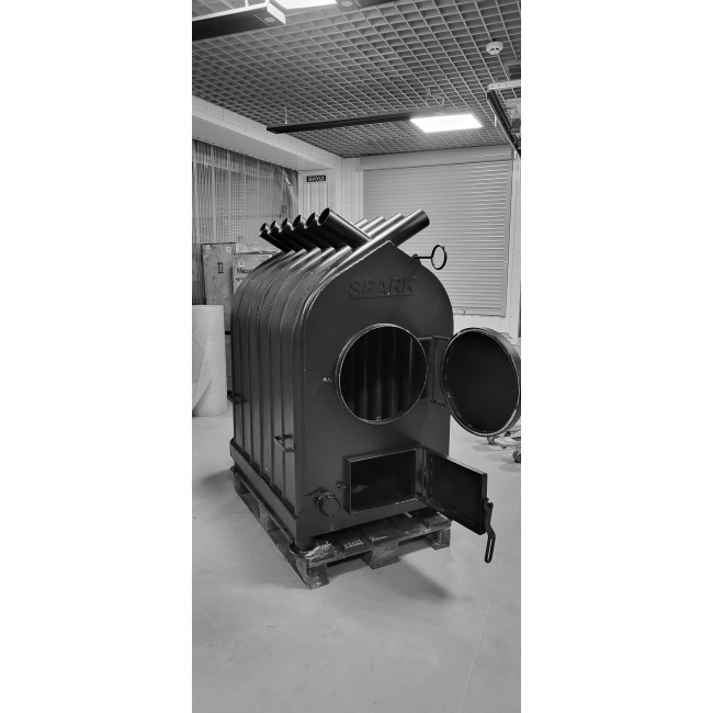 Печь булерян. Предназначен для отопления производственных помещений, СТО, складских помещений. Тело буржуйки обвито трубами диаметром 89мм. Толщина стенки 4мм. Дно печи изготовлено из стали толщиной 8мм. В печи две двери. Для удобства скачивания больших бревен дров используется верхний люк, а в нижнем люке мы разжигаем и выбираем золу. С левой и правой стороны от нижней дверцы расположены инжекторы для подачи уезда в печь. Также в печи есть камера дожига перолизных газов, позволяющая печи гореть до 18 часов. на одной закладке дров. Дождь поленья 980мм. Позади печи установлена турбина мощностью 1,1кВ, выдувающая 2500м3 воздуха температурой от 100 до 250 градусов.