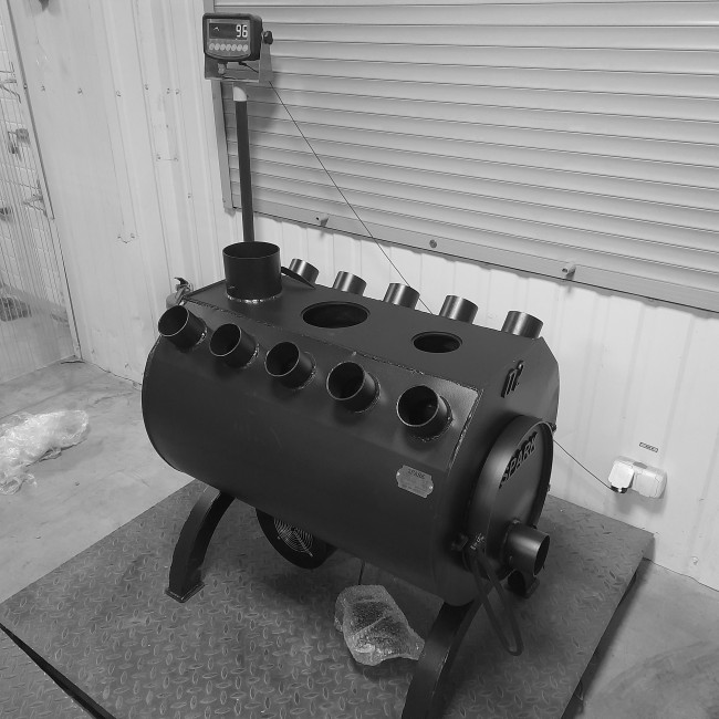 Печь булерян. Предназначена для отопления, гаражей, СТО, частных домов, магазинов, складских помещений. Печь имеет конфорку для приготовления пищи. Благодаря двойному корпусу, через трубы расположенные снизу, печь подтягивает прогреваемый и выходящий холодный воздух через верхние трубы, благодаря чему проходит циркуляция воздуха в помещении. Продолжительность горения печи зависит от влажности дров и настройки тяги от 4-8 часов. Печь оснащена сменным колосником, благодаря которому в булере горят любые дрова. Удобный совок для чистки печи. Печь выполнена профессиональными сварщиками из качественного листового металла. Форма печи (КРУГЛА), благодаря сплошному ребру жесткости, сохраняет ее в первичном состоянии очень много лет.