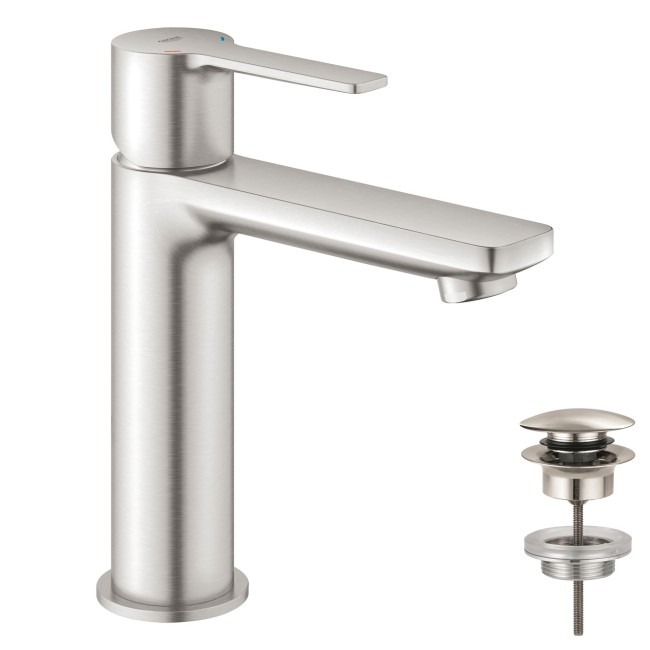 С его гладким цилиндрическим корпусом, четкой прямоугольной рукояткой и изливом, однорычажный смеситель для раковины GROHE Lineare прекрасно смотрится в современной ванной комнате.