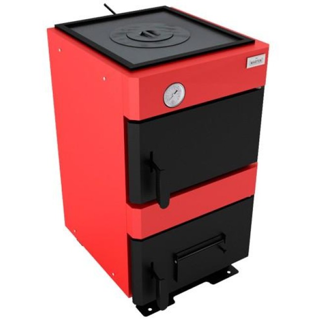 Твердотопливный котел Marten Base MC-12V (бюджетной серии) используется для отопления различных сооружений с площадью до 120 м2. Топливом для котла зачастую являются антрацит, каменный уголь, дрова. Также можно установить регулятор тяги. Оборудован чугунной варочной поверхностью и водяным охлаждаемым колосником. Номинальная мощность 12 кВт. Единоразовая загрузка топлива сгорает от 5 до 8 часов.