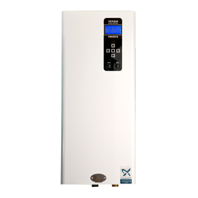 Електричні котли серії «Преміум» ТМ Tenko надають широкі можливості для управління роботою пристрою і забезпечують максимальний комфорт і автономність експлуатації при опаленні різних приміщень з максимальною площею 150 кв.м. Представлена лінійка обладнання відрізняється наявністю вбудованого мікроконтролера і програмної системи управління для повного контролю працездатності котла. Модель котла «Преміум» має цифровий дисплей для настройки і відображення сервісної інформації від трьох датчиків температури: кімнатного (проводового або радіо), датчиків на прямому і зворотному трубопроводах системи опалення. Мікроконтролер здійснює управління блоків ТЕНів і реле, а вбудований програмний лічильник електроенергії веде статистику і дозволяє оптимізувати роботу. Безшумна робота при комутації забезпечується твердотільними реле з водяним охолодженням. всі моделі електрокотлів «Преміум» виробництва компанії Tenko укомплектовані циркуляційним насосом , датчиком тиску, автоматичним відвідників повітря, запобіжним клапаном і недельно/добовим програматором, яким можливо керувати за допомогою wi-fi модуля. Дистанційне керування котлом здійснюється через будь-який браузер або додаток на Android.