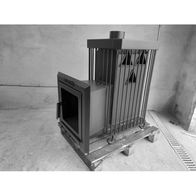 Печь для бани Камянка, рассчитана до 35м3. Все детали печи вырезаны на лазере и собраны профессиональными сварщиками, благодаря чему печь ровная и всегда одинакового размера. Тело печи, усиленное ребрами жесткости, продлевает срок ее использования. В теле печи расположены три треугольника, которые являются отбойниками, находящимися снаружи, а не в середине, как в других печах, что снижает время разогрева парной. Большой совок для пепла, печь монтируется через стену, что позволяет сэкономить место в парной. Сменный колосник. Регулирующие ножки для установки печи на неровной поверхности. Длина полена до 50см. Дымоход 120мм. Количество камней 130кг. +- Двери со стеклом 310/310мм.