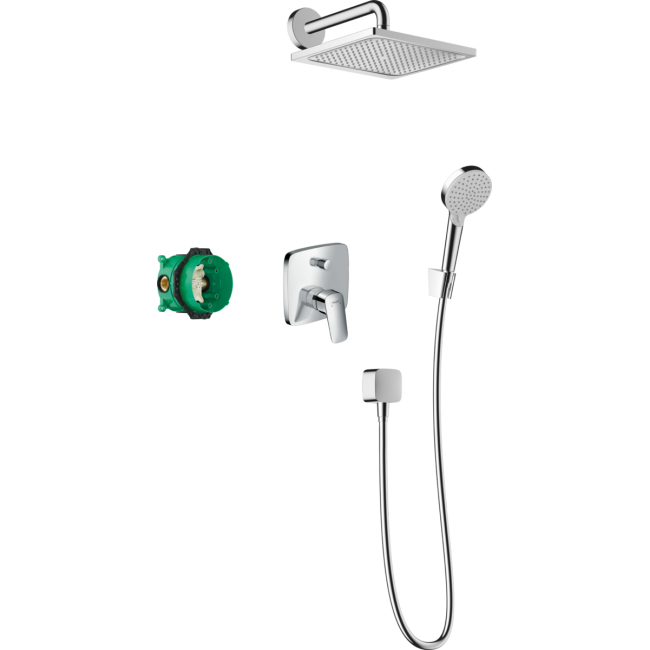 • состоит из: верхний душ, ручной душ, держатель для душа, однорычажный смеситель для ванны, основной комплект, настенная розетка, держатель для душа, шланг для душа