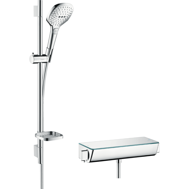 Душовий набір 27038400 — цікаве рішення для облаштування ванної кімнати. У комплект увійшли стильні та практичні аксесуари, серед яких термостат з широкою основою у вигляді полички, покритої загартованим склом. Також до нього додається штанга висотою 65 см, лійка ручного душа зі шлангом довжиною 160 см, тримач для неї і мильниця для брускового мила. Набір розроблений в стильному забарвленні хром, яке добре гармонує з білою сантехнікою та аксесуарами кольору металік.