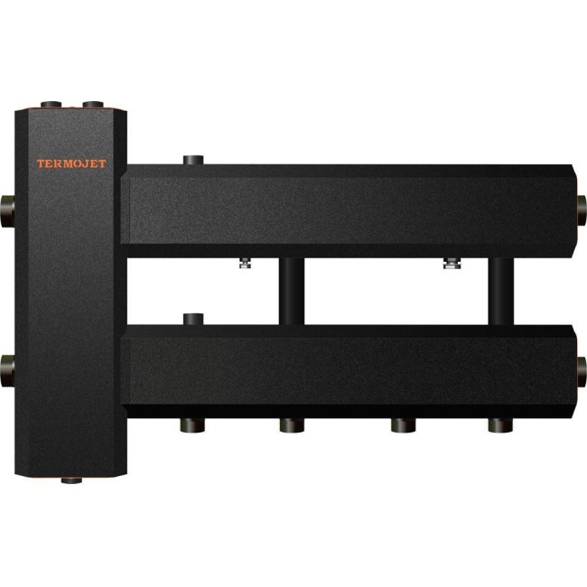 Коллектор с гидрострелкой Termojet КГС22Н.125 (200) с выходами вниз. Коллектор используется в системах отопления, в которых необходимо распределить теплоноситель на несколько потребителей тепла с разными параметрами. В данный вид распределительных коллекторов встроен гидравлический разделитель ГС - 26 для обеспечения более лёгкого монтажа и экономии свободного пространства в котельной. В комплект поставки входят крепления к стене.