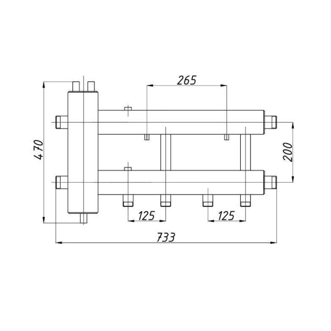 Коллектор с гидрострелкой Termojet КГС22Н.125 (200) без изоляции с выходами вниз. Коллектор используется в системах отопления, в которых необходимо распределить теплоноситель на несколько потребителей тепла с разными параметрами. В данный вид распределительных коллекторов встроен гидравлический разделитель ГС - 26 для обеспечения более лёгкого монтажа и экономии свободного пространства в котельной. В комплект поставки входят крепления к стене.