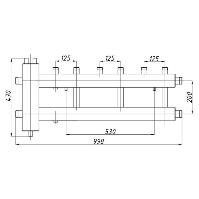 Коллектор с гидрострелкой Termojet КГС32В.125 (200) без изоляции с выходами вверх. Коллектор используется в системах отопления, в которых необходимо распределить теплоноситель на несколько потребителей тепла с разными параметрами. В данный вид распределительных коллекторов встроен гидравлический разделитель ГС - 26 для обеспечения более лёгкого монтажа и экономии свободного пространства в котельной. В комплект поставки входят крепления к стене.
