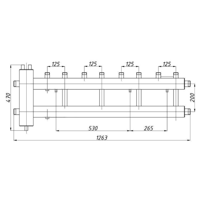 Коллектор с гидрострелкой Termojet КГС42В.125 (200) без изоляции с выходами вверх. Коллектор используется в системах отопления, в которых необходимо распределить теплоноситель на несколько потребителей тепла с разными параметрами. В данный вид распределительных коллекторов встроен гидравлический разделитель ГС - 26 для обеспечения более лёгкого монтажа и экономии свободного пространства в котельной. В комплект поставки входят крепления к стене.
