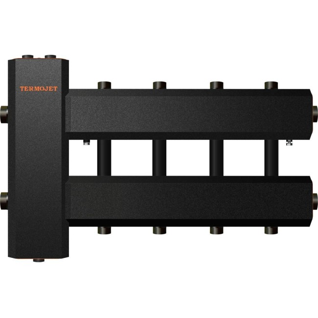 Коллектор с гидрострелкой Termojet КГС42ВН.125 (200) с выходами вверх и вниз. Коллектор используется в системах отопления, в которых необходимо распределить теплоноситель на несколько потребителей тепла с разными параметрами. В данный вид распределительных коллекторов встроен гидравлический разделитель ГС - 26 для обеспечения более лёгкого монтажа и экономии свободного пространства в котельной. В комплект поставки входят крепления к стене.