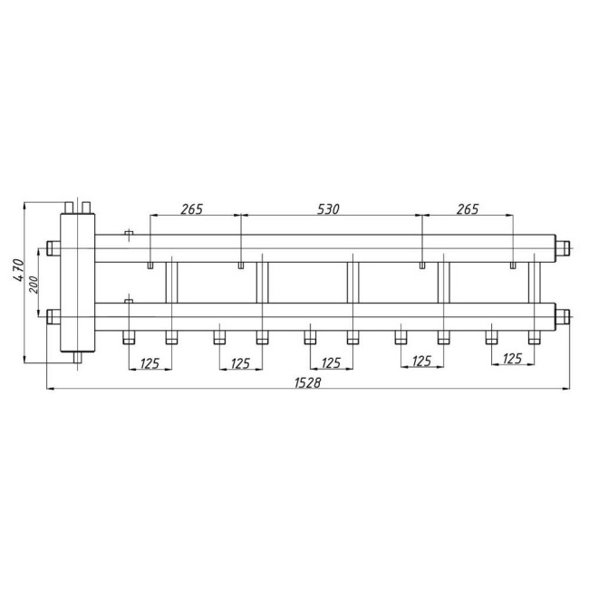 Коллектор с гидрострелкой Termojet КГС52Н.125 (200) без изоляции с выходами вниз. Коллектор используется в системах отопления, в которых необходимо распределить теплоноситель на несколько потребителей тепла с разными параметрами. В данный вид распределительных коллекторов встроен гидравлический разделитель ГС - 26 для обеспечения более лёгкого монтажа и экономии свободного пространства в котельной. В комплект поставки входят крепления к стене.