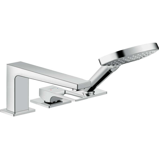 • состоит из: однорычажный смеситель на край ванны на 3 отверстия, ручной душ, держатель для душа