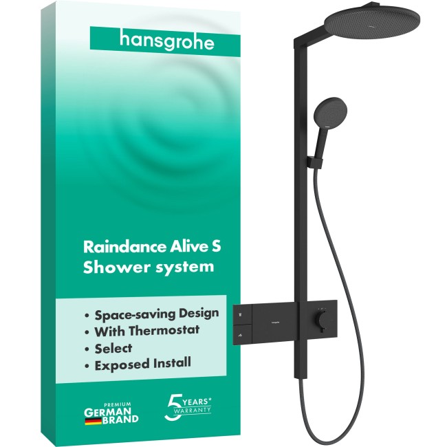 Відкрийте для себе світ досконалого комфорту з душовою системою hansgrohe Raindance Alive S 300 1jet з ShowerSelect Comfort, 24582670 у стильному чорному матовому виконанні. Ця інноваційна душова система з категорії “Душові системи” ідеально поєднує сучасний дизайн, передові технології та максимальну функціональність для вашої ванної кімнати. Головною особливістю душової системи є великий верхній душ Raindance S 300, який забезпечує м’який та рівномірний потік води завдяки технології AirPower. Це створює відчуття справжнього дощу, огортаючи тіло приємними краплями, що дарують справжню насолоду від кожного прийому душу. Завдяки функції 1jet ви зможете насолодитись ідеальною інтенсивністю води, яка забезпечує повноцінний релакс після важкого дня. Інтуїтивно зрозуміле управління ShowerSelect Comfort дозволяє швидко вибирати потрібні режими роботи натисканням однієї кнопки. Надійний термостат гарантує постійну температуру води та захищає від перепадів тиску, що забезпечує безпеку та комфорт для всієї родини. Для зручності догляду, поверхня душової системи оснащена інноваційним покриттям QuickClean, яке легко очищується від вапняного нальоту та забруднень. Стильний чорний матовий колір підкреслює сучасний інтер’єр та додає розкішних акцентів у ванній кімнаті. Висока якість матеріалів гарантує довговічність та надійність використання. Не відкладайте комфорт на потім! Купуйте душову систему hansgrohe Raindance Alive S 300 1jet з ShowerSelect Comfort, 24582670 чорний матовий онлайн у нашому магазині з доставкою по всій Україні. Офіційна гарантія 5 років – ваш спокій та впевненість у виборі!