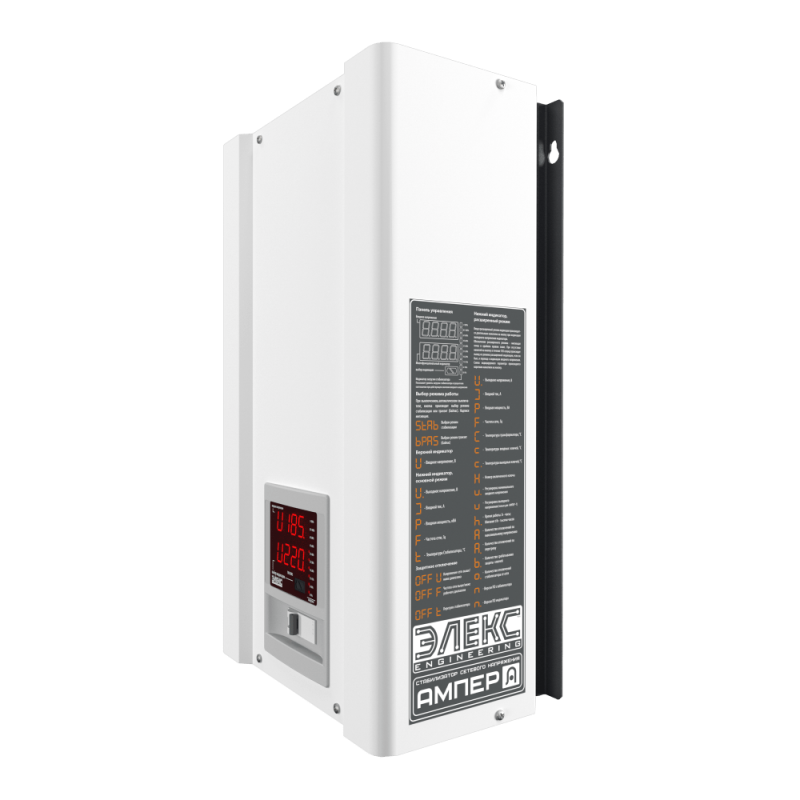 К особенностям данного стабилизатора можно отнести двойной светодиодный экран, линейную полосу загрузки, наличие электронного транзита (байпас), удобное расположение клеммной колодки для подключения на задней части корпуса, бесшумную работу за счет использования в качестве силовых ключей симисторов.