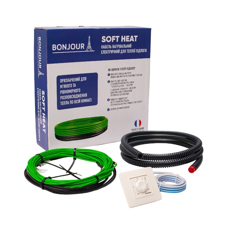 Комплект нагревательный Bonjour Soft Heat EcoTWIN-220-18 W/m з терморегулятором RTP – двужильный электрический нагревательный кабель от французского бренда Atlantic, производитель ООО «Термопад ПВТ», Индия.