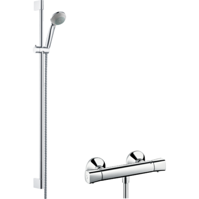 Душовий набір 27080000 — компактне і вигідне рішення для установки в душовій зоні. До нього увійшла латунна штанга висотою 90 см, лійка ручного душа зі шлангом 160 см і утримувач для неї. Також в наборі запропонований універсальний термостат з вентильним керуванням, який буде забезпечувати водою завжди тільки комфортної і безпечної температури. Лійка ручного душа працює в двох режимах подачі води — звичайному і Vario. Для перемикання струменів передбачений поворотний диск.